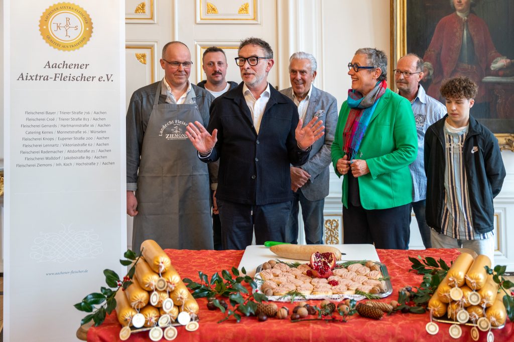 14. November 2024Auch in diesem Jahr wurde im prunkvollen Weißen Saal des Aachener Rathauses feierlich die diesjährige Aachener Weihnachtsleberwurst angeschnitten. Oberbürgermeisterin Sibylle Keupen unterstrich die Wichtigkeit unseres traditionellen Handwerks und lobte die Frische, Originalität und Regionalität der originalen „Oecher Weihnachtsleberwurst“, die nur bis zu Weihnachten produziert und verkauft wird. Die Aachener Weihnachtsleberwurst trägt mit Stolz schon seit 2016 die Abkürzung „g. g. A.“ für „geschützte geografische Angabe“.